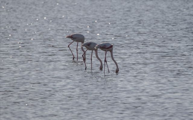 Dünyanın en önemli sulak alanları arasında yer alan Gediz Deltası'ndaki İzmir Kuş Cenneti, sonbahar mevsiminde de flamingolara ev sahipliği yapıyor. Türkiye'nin Tuz Gölü ile birlikte ikinci flamingo üreme noktası olan Gediz Deltası'nda mevcut doğal kuluçka adasının dalga erozyonuyla erimesi nedeniyle 2011 yılında oluşturulan ve yaklaşık 6,5 dönüm yüz ölçümüyle dünyanın en büyük yapay kuluçka adasında bulunan flamingolar, beslenmek için gün boyunca su içerisinde yiyecek arayışını sürdürdü. (AA)