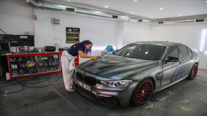 Mor renkli saçı, ojeli tırnaklarıyla sanayide herkesin dikkatini çeken Ayter, yaklaşık 6 yıldır araçlara müşterilerinin isteğine göre farklı desen ve motiflerde "airbrush"la kaplama yapıyor.