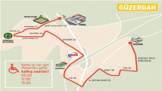 Menemen’de 16 Kasım Pazartesi’nden itibaren başlayacak “Engelsiz Ulaşım” hizmeti ile engelli vatandaşlar Menemen Garajı ile Menemen Devlet Hastanesi arasında seyahat edebilecekler. Hafta içi her gün Menemen Garajı’ndan 09.00, 12.00 ve 16.00 saatlerinde kalkacak olan özel olarak hazırlanmış servisin engellilerin şehir içi ulaşımlarında kolaylık sağlaması amaçlanıyor.