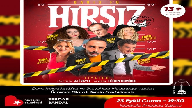 Bayraklı Belediyesi, İtalyan yazar Dario Fo’nun yazdığı, Suat İnal ve Ali Yaylı’nın sahneye uyarlayıp yönettiği ‘Hırsız’ adlı oyununu Bayraklılı sanatseverlerle buluşturacak. Ücretsiz davetiyeler Kültür ve Sosyal İşler Müdürlüğü’nden temin edilebilecek. Tepekule Kongre ve Sergi Merkezi Anadolu Salonu’nda 23 Eylül Cuma sahnelenecek oyun saat 19:30’da başlayacak. İtalya’da geçen oyunun hikayesinde; bir hırsızlık çetesinin soygun için girdiği politikacının evinde yaşadığı komik olaylar anlatılacak. Tek perdelik oyunda ünlü oyuncular Umut Oğuz, Somer Karvan, Suat İnal, Tuna Arman, Ceren Bayır ve Ebru Karanfilci seyirci karşısına çıkacak.