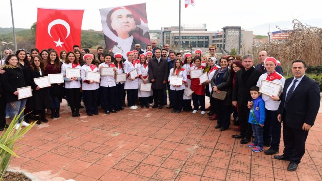 Bornova Belediyesi’nin Uzman Pastacılar Derneği, İşkur ve Milli Eğitim Müdürlüğü işbirliği ile EVKA-3’teki Mutfak Atölyesi’nde düzenlediği Aşçılık, Pastacılık ve Barista Kursu ikinci dönemini tamamladı. Kursa katılarak 6 aylık eğitim alan kursiyerler düzenlenen tören ile katılım belgelerini almanın heyecanını yaşadı. 25’i Aşçılık, 25’i Pastacılık ve 10’u Barista olmak üzere üç farklı kategoride eğitim alan 60 kursiyer katılım belgelerini Bornova Belediye Başkanı Olgun Atila’nın elinden aldı.