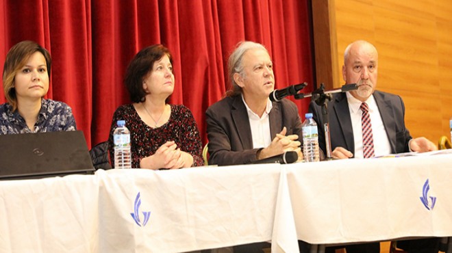 Panelde, TMMOB İzmir Şehir Plancıları Odası Başkanı Özlem Şenyol Kocaer ve Sosyal Psikoloji Uzmanı Prof. Dr. Melek Göregenli Körfez Geçiş Projesi’nin maliyeti ve kente vereceği zararları anlattı.