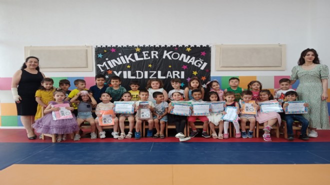 Geleceklerini şekillendirecek ilk basamak olan okul öncesi eğitimlerini Konak Belediyesi Minikler Konağı’nda başarıyla tamamlayan toplam 55 miniğe verilen karnelerde ise “Gülüşünle bizlere yansıttığın enerjin ve göstermiş olduğun üstün başarılarından dolayı bu belgeyi almaya hak kazandın” ifadeleri yer alıyor. Eğlenceli olduğu kadar duygusal anların da yaşandığı etkinliklerde veliler de çocuklarına okul öncesi ücretsiz eğitim olanağı sağladığı için Konak Belediye Başkanı Abdül Batur’a teşekkürlerini iletti.