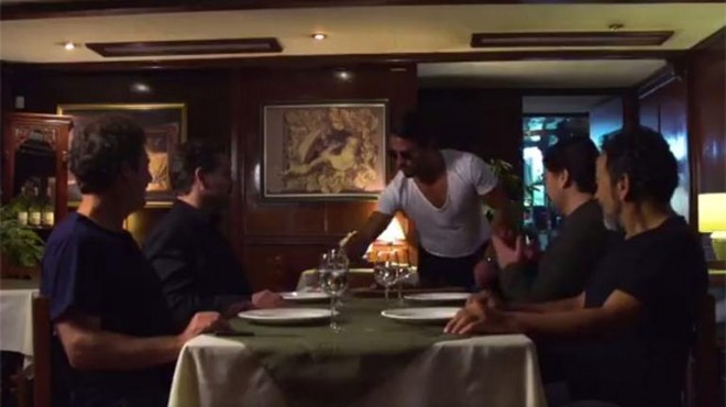 Nusret Gökçe ekibe restoranda et servis ediyor ve meşhur hareketini yapıyor. (Hürriyet)
