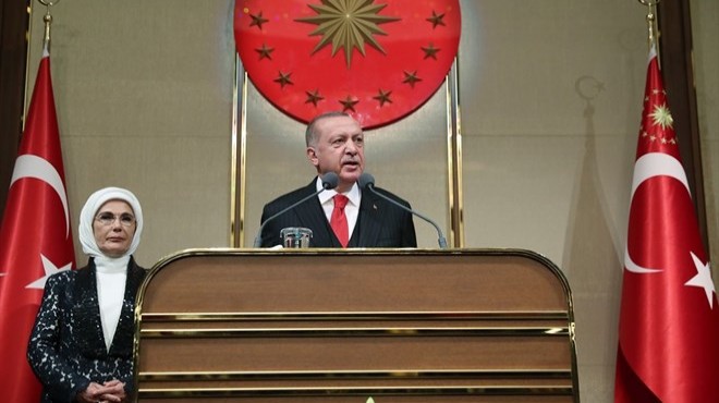 Konuşmasına, "Barış Pınarı Harekatı'nın cereyan ettiği böyle bir dönemde sizleri Cumhuriyetimizin kuruluşunun 96'ncı yıl dönümünde en kalbi duygularla selamlıyorum. Cumhurbaşkanlığı Külliyesi'ne, milletin evine, bu gazi mekana hoş geldiniz." ifadeleriyle başlayan Erdoğan, törene teşrifleri için katılımcılara teşekkür etti, yurt içi ve yurt dışında yaşayan tüm vatandaşların bayramını kutladı.