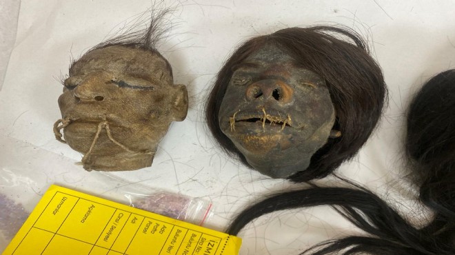 Aliağa ilçesinde bir ev ve depoya geçen yıl 14 Aralık'ta 3 gün arayla yapılan operasyonlarda farklı dönemlere ait tarihi eser, etnografik eser, yağlı boya tablo, kilise malzemeleri, kitap, ikona ve farklı kültürlere ait eserlerin içinde olduğu 1045 obje ele geçirildi. Eserler arasında Peru ve Amazon'un derinliklerinde yaşayan Jivaro yerlilerinin kesip özel işlemlerden geçirerek küçülttükleri, 'tsantsa' olarak adlandırılan insan başları dikkat çekti.