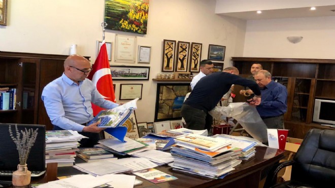 31 Mart'ta yapılan yerel seçimlerde İzmir Büyükşehir Belediye Başkanı olarak seçilen CHP'li Tunç Soyer, henüz mazbatasını almadı. Büyükşehir Belediyesi'nde göreve başlamak için gün sayan Soyer, 2 dönem boyunca belediye başkanlığı yaptığı Seferihisar'daki görevine veda etti. Başkanlıkta makam odasındaki eşyalarını toparlayan Soyer, 10 yıl boyunca çalıştığı çalışma odasını yeni seçilen CHP'li İsmil Yetişkin'e bırakacak. (DHA)