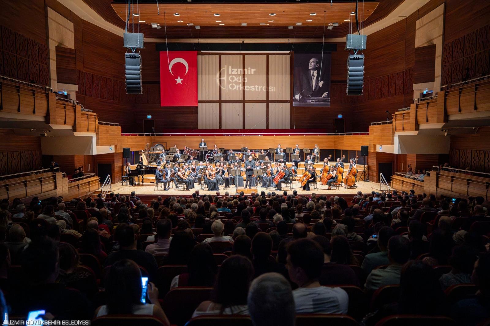Cumhuriyet'in 102. yılı İzmir'de coşkuyla kutlanıyor. İzmir Oda Orkestrası da Ahmed Adnan Saygun Sanat Merkezi'nde Cumhuriyet Bayramı Konseri ile dinleyicilere unutulmaz bir gece yaşattı. Şef Orhun Orhon yönetiminde, soprano Görkem Ezgi Yıldırım ve bariton Arda Aktar’ın solistliğinde düzenlenen anlamlı konserde klasik batı müziğinin Türk öncü bestecilerinin eserleri ve seçkin aryalar yer aldı. Konser salonu Cumhuriyet sevdalıları İzmirli yurttaşlarla dolarken, İzmir Büyükşehir Belediye Başkanı Dr. Cemil Tugay da konseri eşi Öznur Tugay ile birlikte izledi.