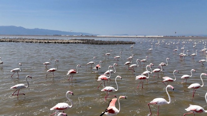 İzmir'de doğal güzelliğiyle öne çıkan İzmir Kuş Cenneti'nde, bu yıl yaklaşık 13 bin yavru flamingo dünyaya geldi. Yavru flamingoların ağustos ayı gibi uçmaya başlayıp Akdeniz'e kıyı ülkelere yolculuklarının başlayacağını belirten İzmir Kuş Cenneti Saha Sorumlusu Celal Murat Aslanapa, "Flamingolar, ekosisteme faydalıdır. Tuzlu su karidesinin yumurtalarıyla beslenirler. Normalde tuzlu su karidesinin yumurtaları kendi kendine çatlamaz, serttir. Flamingoların sindirim sisteminden geçtikten sonra çatlar" dedi.