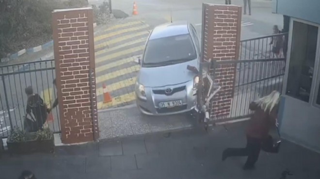 Bu arada kaza bir iş yerinin güvenlik kamerasına yansıdı. Görüntülerde, öğretmenin okulun giriş kapısı önünde bulunan 2 çocuk ve 2 veliyi koşarak gelip uyardığı görüldü. 4 kişi son anda kurtulurken, otomobil okulun bahçesine duvarı kırıp girdiği ve çevredekilerin yaşadığı panik anları da kameraya yansıdı.