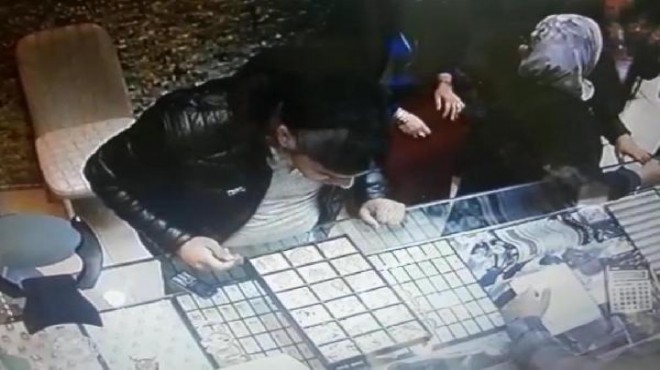 Öte yandan yaşanan hırsızlık olayı, dükkanın güvenlik kamerasına saniye saniye yansıdı. Görüntülerde, şahsın kendisine gösterilen kolye uçlarına bakarken, Turan başka bir müşteriyle ilgilendiği sırada kolye ucunu çalıp avucunun içinde aldıktan sonra cebine koyup kuyumcudan ayrıldığı görülüyor.