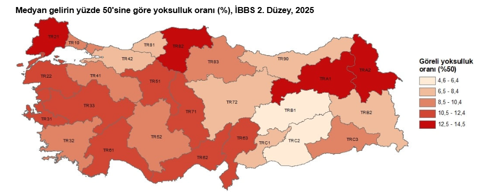 Gelire dayalı göreli yoksulluk oranının en yüksek olduğu bölgeler; %14,5 ile TR21 (Tekirdağ, Edirne, Kırklareli), %14,3 ile TR82 (Kastamonu, Çankırı, Sinop) oldu.