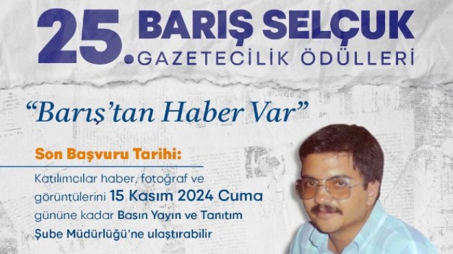 İzmir Büyükşehir Belediyesi tarafından 25’incisi düzenlenen Barış Selçuk Gazetecilik Yarışması için başvurular devam ediyor. Barış Selçuk’un anısını yaşatmak ve genç gazetecileri teşvik etmek amacıyla düzenlenen Barış Selçuk Gazetecilik Ödülleri Yarışması’nda katılımcılar haber, fotoğraf ve görüntülerini, 15 Kasım 2024 Cuma gününe kadar İzmir Büyükşehir Belediyesi Basın Yayın ve Tanıtım Şube Müdürlüğü’ne ulaştırması gerekiyor.