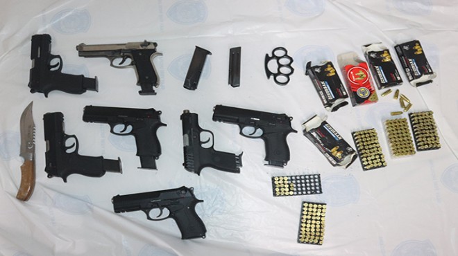 Yapılan aramalarda 16 ruhsatsız tabanca, silahlara ait fişekler, 2 muşta, 1 bıçak ele geçirildi. Suçta kullanıldığı değerlendirilen 7 cep telefonu ile dizüstü bilgisayara da el kondu.