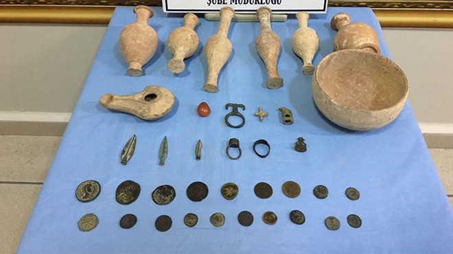 İZMİR - İzmir Emniyet Müdürlüğü Kaçakçılık Suçlarıyla Mücadele Şube ekipleri, Karşıyaka ilçesinde oturan B.K.'nin elinde çok sayıda tarihi eser bulunduğunu öğrenince harekete geçti. B.K. evinde gözaltına alınırken, farklı dönemlere ait 6 pişmiş topraktan gözyaşı şişesi, 1 toprak kandil, 1 toprak kase, 3 bronz ok ucu, 1 bronz mühür, 1 bronz yüzük, 1 kurşun haç, 2 bronz obje, 16 bronz sikke olmak üzere toplam 32 eser ele geçirildi. Eserler İzmir Müze Müdürlüğü'ne teslim edilirken, B.K. hakkında yasal işlemlere başlandı. (DHA)