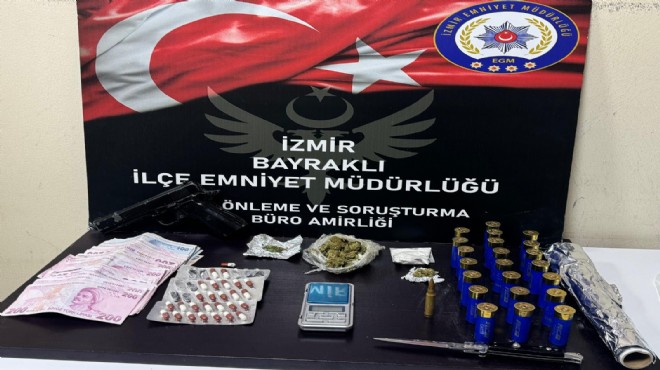 Bayraklı İlçe Emniyet Müdürlüğü'ne bağlı Suç Önleme ve Soruşturma Büro Amirliği ekipleri, ilçede M.P. isimli şüphelinin adresinde uyuşturucu madde olduğu ve 33 yıl kesinleşmiş hapis cezası ile arandığı bilgisi üzerine harekete geçti. Yapılan hazırlığın ardından M.P.'nin adresine operasyon düzenlendi. Evde yapılan aramada 22.5 gram esrar, 28 sentetik hap, 19 gram içi boşaltılmış sentetik hap, 1 uzun namlulu silah fişeği, 22 pompalı tüfek kartuşu, 1 tabanca ve 12 bin 245 lira para ele geçirilirken, şüpheli M.P. de yakalandı. Gözaltına alınan M.P., işlemler için emniyet müdürlüğüne götürüldü. (DHA)