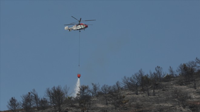 İzmir'in Menderes ilçesinde çıkan orman yangınının gece saatlerinde kontrol altına alınmasının ardından bölgedeki soğutma çalışmaları hava ve karadan sürüyor.
