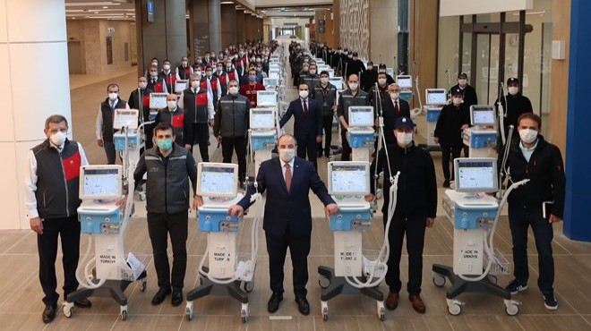 Nitekim bakanlığımızın destekleriyle kurulan Biosys isimli bir girişim firmasının bu alanda yaptığı çalışmalar, geliştirdiği bir ürün zaten vardı. Bu çalışmaları hızla seri üretime dönüştürmek için yerli firmalarımız bir milli seferberlik başlattı. Onlarca mühendis bir araya geldi, gece gündüz çalıştılar ve büyük bir özveriyle sadece 14 gün gibi kısa bir sürede seri üretim bandından ilk yerli ve milli yoğun bakım solunum cihazlarını indirdiler. Bugün testleri tamamlanmış ürünlerin bir kısmını Sağlık Bakanlığı'mıza teslim ediyoruz. İnşallah mayıs sonuna kadar 5 bin cihaz üretilmiş olacak. Tüm çabamız, sağlık çalışanlarımızın insanüstü emeklerine bir nebze de olsa katkı sağlamak."