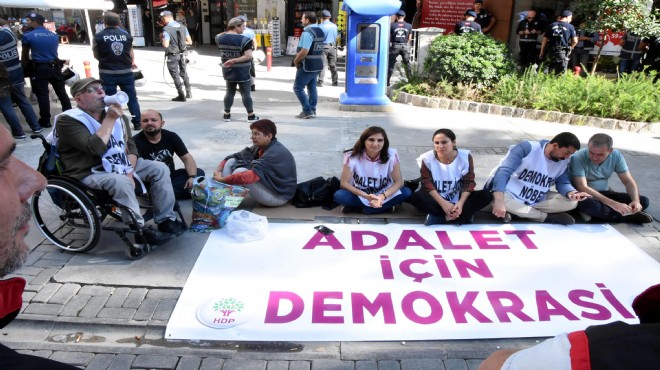 Diyarbakır, Van ve Mardin büyükşehir belediyelerine kayyum atanmasının ardından, bu illerde yapılmaya başlanan 'Demokrasi Nöbeti'nin, HDP MYK'nın İzmir ve İstanbul'da da yapılması kararı almasının ardından, İzmir'de Alsancak Kıbrıs Şehitleri'ndeki Türkan Saylan Kültür Merkezi önüne gelen HDP İzmir Milletvekili Serpil Kemalbay, Şanlıurfa Milletvekili Ayşe Sürücü, Muş Milletvekili Şevin Coşkun, İstanbul Milletvekili Musa Piroğlu ve Iğdır Milletvekili Habip Eksik, basın açıklaması yaptı. Vekiller, açıklamanın ardından, ellerindeki, 'Adalet için Demokrasi' pankartını önlerine serip, oturma eylemine başladı. İzmir Emniyet Müdürlüğü'ne bağlı çeşitli ekipler, çevrede güvenlik aldı. Bölgede TOMA da hazır bekletildi.