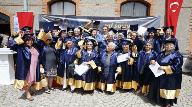 Konak Belediyesi'nin Kadın, Sosyal Politikalar ve Projeler Müdürlüğü'ne bağlı hizmet veren Ziya-Zişan Saadet Aytulun Kardeşler İleri Yaş Sağlıklı Yaşam Merkezi'nin 80'li yaşlarını süren kursiyerleri, öğrenmek ve üretmek için çaba gösteriyor. Merkezde verilen ahşap boyama, örgü, takı, karakalem resim gibi kursların yanı sıra Türk Halk Müziği Korosu'na da gelen, ikinci baharını yaşayan 30 kursiyer bu dönemi başarıyla tamamladı. Ziya-Zişan Saadet Aytulun Kardeşler İleri Yaş Sağlıklı Yaşam Merkezi'nin yetkilileri de yaşama sevinciyle dolu bu çok özel kursiyerlerine dönem sonu sergi açılışında kep töreni düzenleyerek sürpriz yaptı. Kursiyerlerin mutluluklarına Konak Belediye Başkanı Abdül Batur da eşlik etti. Kursiyerler başarıyla bitirdikleri dönemin sonunda sertifikalarını da Başkan Batur'un elinden aldı. Batur, öğrenmenin yaşı olmadığını kanıtlayan kursiyerleri üretkenliklerinden ve azimlerinden dolayı kutlayarak, onların kep fırlatma seremonisine de tanıklık etti. Kursiyerler, kendilerine sağlanan fırsatlar için Başkan Abdül Batur'a teşekkür ederek, günün anısına bol bol fotoğraf çektirdi.