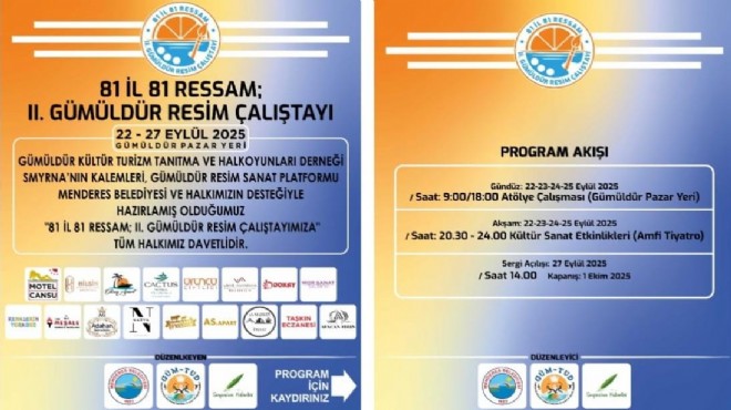 Menderes Belediyesi’nin katkıları ile Gümüldür Kültür Turizm Tanıtma ve Halk Oyunları Derneği’nin düzenlediği 2. Gümüldür Resim Çalıştayı 22-27 Eylül tarihleri arasında gerçekleştirilecek. 81 ilden 81 ressamın yer alacağı çalıştayda çeşitli etkinlikler ve atölyeler düzenlenecek. Yoğun bir program akışı ile dolu dolu geçecek olan çalıştayın son gününde sergi açılışı yapılacak. Sergi 1 Ekim tarihine kadar ziyaret edilebilecek. Çalıştaya, Menderes Belediyesi’nin yanı sıra Smyrna’nın Kalemleri ve Gümüldür Resim Sanat Platformu’da destek veriyor.