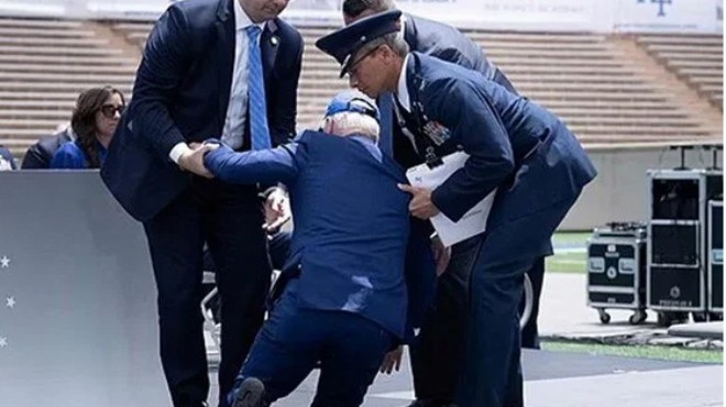Biden, korumaları ve sahnedeki Hava Kuvvetleri subayının yardımıyla ayağa kalktı. Ayağa kalktıktan sonra yerde duran bir şeye işaret eden Biden'ın ayağının oraya takıldığını ima ettiği görülüyor.