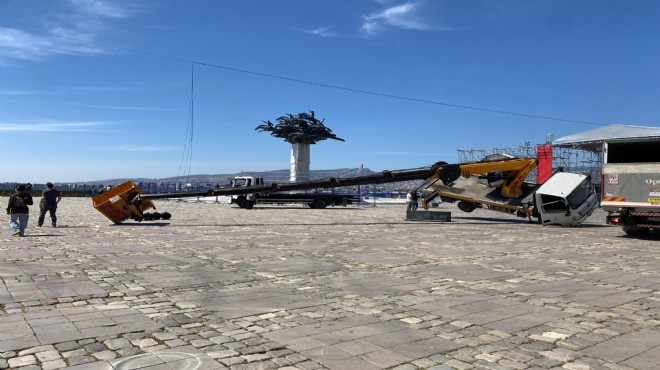 AK Parti İzmir İl Başkanı Bilal Saygılı'nın açıklaması şu şekilde; "Alsancak Gündoğdu Meydanı’nda CHP'nin mitingi için kurulan sahnede vinç devriliyor, bir vatandaş yaralanıyor.