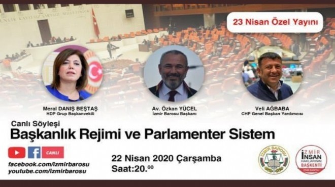 GERÇEKİZMİR - İzmir Barosu tarafından 23 Nisan Özel Yayını olarak düzenlenen, İzmir Barosu Başkanı Avukat Özkan Yücel, Cumhuriyet Halk Partisi (CHP) Genel Başkan Yardımcısı Veli Ağbaba ve Halkların Demokratik Partisi (HDP) Grup Başkanvekili Meral Danış Beştaş’ın katılımıyla gerçekleşecek olan panele AK Parti kanadından tepkiler sürüyor.