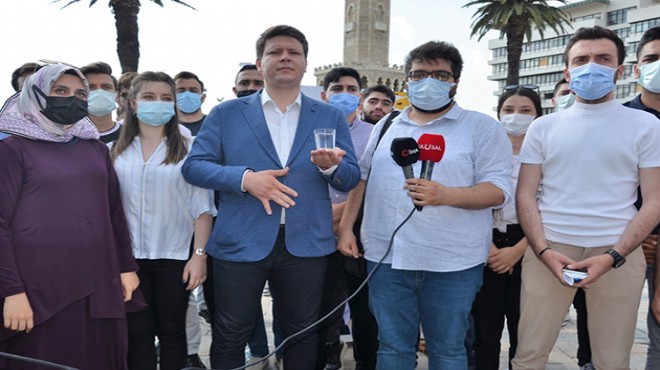 "Tunç Soyer'in İzmir'e bakış açısı da tam olarak budur. Biz artık Sayın Tunç Soyer'den hizmet beklemiyoruz. Gençlik merkezlerinden, sinema ve tiyatro salonlarından, kütüphanelerden umudumuzu çoktan kestik. Şikayetlerimize ve sözlerimize kulak verip şehrimizin temel sorunlarını ciddiye alması bile bizi zaten şaşırtmaya yetecektir. Evet biz İzmirliler olarak, insan onuruna yaraşır bir yaşam için mücadele etmeye devam edeceğiz. Bugün burada ellerimizde birer bardak suyla bulunuyoruz. Bu bir bardak suyu Sayın Tunç Soyer'e hep birlikte gösteriyoruz. Sağlığımız için bir bardak su için fırtına koparmaya devam edeceğiz."