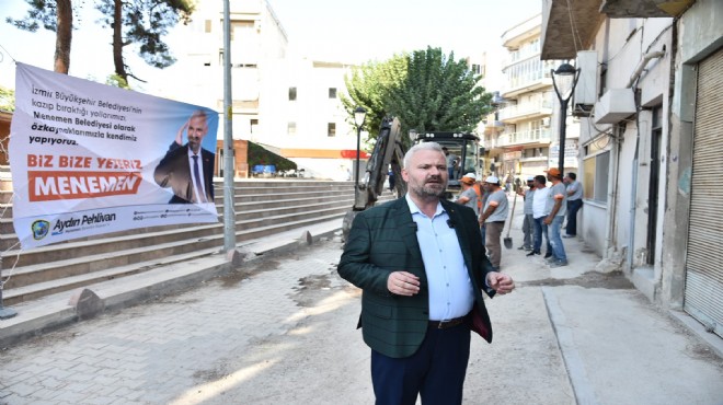 İzmir Büyükşehir Belediyesi'nin kazıp iş bitince bir türlü yaşanılır hale geri getirmediği yolları, kendi irademizle ve özkaynaklarımızla kapatacak, onların delik deşik edip bıraktıkları yolları biz yapacağız. Değerli Menemenliler, Menemen'in bir ferdi ve Menemen'in öz evladı olarak, Aydın Pehlivan olarak sizlere söz veriyorum; gündüz oturmayacak gece uyumayacağız, üzerimize hesap yapanların hesabını bozacağız.
