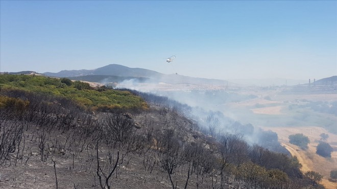 İzmir'in Aliağa ilçesinde Nemrut Körfezi'nde yer alan bir limanın yakınındaki ağaçlandırma sahasında çıkan yangına müdahale ediliyor.