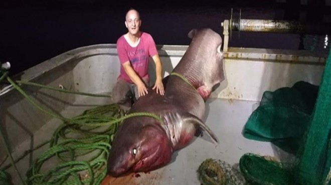 Çanakkale'nin Ayvacık ilçesi Babakale açıklarında balıkçı ağlarına, 5 metre uzunluğunda ve 1 ton ağırlığında camgöz cinsi köpek balığı takıldı.