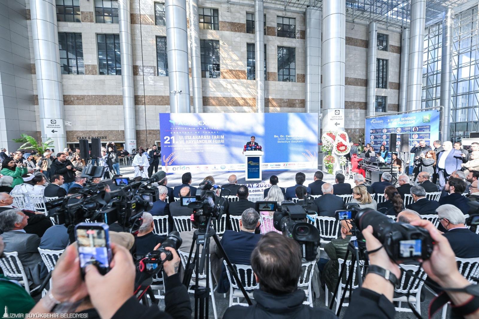 Açılış töreninde konuşan İzmir Büyükşehir Belediye Başkanı Dr. Cemil Tugay, İzmir’in tarım ve fuarcılık kenti olduğunu vurguladı. Fuarda, tarım sektörünü ileriye taşıyacak birçok yenilikçi çözümün yer aldığını belirten Tugay, yapay zekâ destekli tarım makineleri, akıllı sulama sistemleri, veri temelli üretim modelleri ile su verimliliğini artıran teknolojilerin önemine dikkat çekti. Bu çözümlere herkesin ihtiyaç duyduğunu ifade eden Tugay, dünyanın zorunlu bir dönüşüm sürecinden geçtiğini söyledi. Küresel ölçekte ciddi krizlerle karşı karşıya olunduğunu belirten Tugay, gıda krizi, iklim krizi, su krizi ve kuraklığın artık birbirinden ayrı başlıklar olmadığını vurguladı. Birleşmiş Milletler Gıda ve Tarım Örgütü verilerine göre 2024 itibarıyla dünyada 673 milyon insanın açlıkla mücadele ettiğini, yaklaşık 2 milyar 600 milyon kişinin ise sağlıklı beslenemediğini aktaran Tugay, bilim insanlarının gezegenin 1 derece ısınmasının temel tarım ürünlerinde yaklaşık yüzde 10 verim kaybına yol açacağını ortaya koyduğunu söyledi.