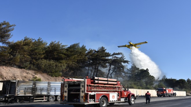 İzmir'in Kemalpaşa ilçesinde tırda başlayarak ormana sıçrayan yangın havadan ve karadan müdahaleyle büyümeden kontrol altına alındı.