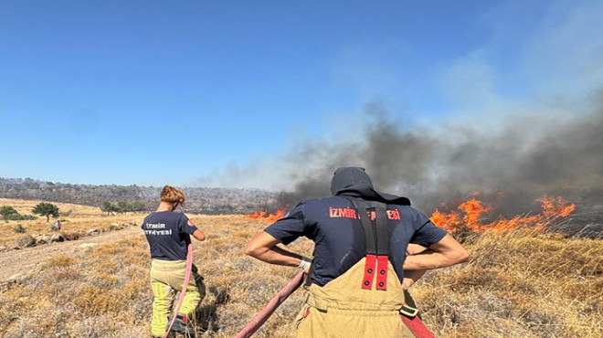 Aliağa Kalabak ve Çoraklar mahalleleri arasında başlayan ot yangını ise şiddetli rüzgarın etkisi ile geniş bir alana yayıldı. İzmir İtfaiyesi bir yandan yangını kontrol altına almak için çalışırken diğer taraftan ise alevlerin Aliağa Organize Sanayi Bölgesi’ne (ALOSBİ) ulaşmaması için önlemlerini arttırdı. Öte yandan yangının tehdit ettiği Çoraklar bölgesindeki hayvan damları da tahliye edildi.