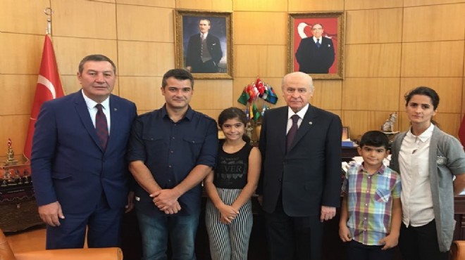 MHP İzmir İl Başkanı Necat Karataş ile Ankara'ya giden baba Serkan Sakin ile eşi Buket ve çocukları Yaren ve Emirhan, parti genel merkezinde Bahçeli ile görüştü.