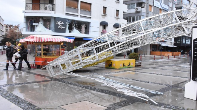 İZMİR - Konak Belediyesi’nin yılbaşı kutlamaları çerçevesinde yaptığı süslemelerden olan Alsancak’taki Şevket Özçelik Sokak’ta bulunan ışıklı kemer, saatte 35 kilometre hızla esen şiddetli rüzgar nedeniyle gece saatlerinde devrildi.
