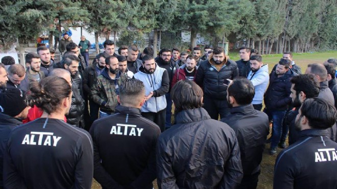 Oyunculardan en iyi şekilde mücadele etmelerini isteyen siyah-beyazlılar, "Yenseniz de yenilseniz de mücadele ettiğiniz takdirde zaten bu taraftar sizi alkışlıyor. Artık söz bitti. Bu taraftara özür borcunuz var. Bir dahaki sefere kazma saplarıyla geliriz. Kalan iki maçı kazanın, bu iş bitsin" dedi. İdmanın başlamasına kısa bir süre kala böyle bir olayın yaşanması futbolcuları ve teknik ekibi şok etti. Özellikle yabancı oyuncuların hiç tanık olmadıkları bir durumla karşılaştıkları ve endişelendikleri öğrenildi. Takımla konuşan taraftarlar ardından tesisleri olaysız bir şekilde terk etti. Altay resmi sosyal medya hesabından "Altay 1914 Taraftarlar Derneğimiz antrenman öncesi A takım oyuncularımız ile bir araya geldi" açıklamasını yaptı. (DHA)