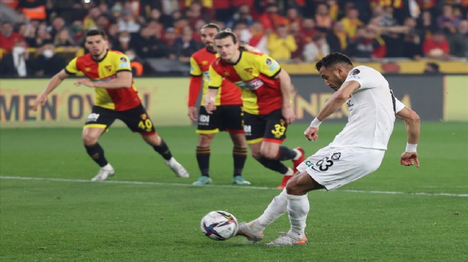 38. dakikada kaleci İrfan Can Eğribayat'la karşı karşıya kalan Kazımcan Karataş, Göztepe ceza sahasında yerde kaldı. Hakem Sarper Barış Saka, VAR uyarısıyla izlediği pozisyonun ardından penaltı kararı verdi.