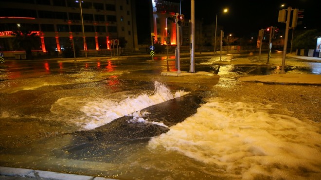 İnkılap Mahallesi Koşuyolu Caddesi'nde İzmir Su ve Kanalizasyon İdaresi Genel Müdürlüğü'ne (İZSU) ait ana su borusu, henüz belirlenemeyen bir nedenle patladı.