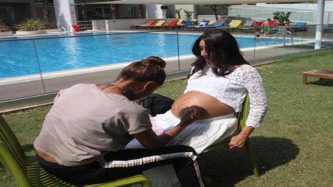 Oğlunun ultrason görüntülerinden çok etkilendiğini anlatan genç anne adayı Duygu Özyurtlu (32) ultrasondaki haline benzettiği için uyuyan bir melek resmi seçtiğini belirtti. Doğum fotoğraflarının sadece anne babaya özel olduğunu vurgulayan Özyurtlu, "Bebişimiz doğmadan üçümüzün paylaştığı aile olarak ilk anımız olacak. Eşimle mutlaka bir doğum fotoğrafı çektirelim istiyorduk. Ama karın boyama sanatını duyunca bunu tercih ettik. Çevremize danıştık, herkes çok destekledi. Hamileliğimin 31'inci haftasındayım. Simge hanımla iki ay önce konuşmaya başladık. Ama karnımın büyüklüğü nedeniyle özellikle bu haftayı seçtik" dedi. Bebeğinin de fırçaya tepki verdiğini söyleyen Özyurtlu, "Şuan içimde kıpır kıpır. Başladığımızda uyuyordu galiba. Ama fırçalar onu uyandırdı. Karnımın içinde fırçayı takip ediyor resmen. Hoşuna gitti sanırım. Birkaç farklı çizim yaptıracağım, belki bir iki gün temizlemeyebilirim" diye konuştu.