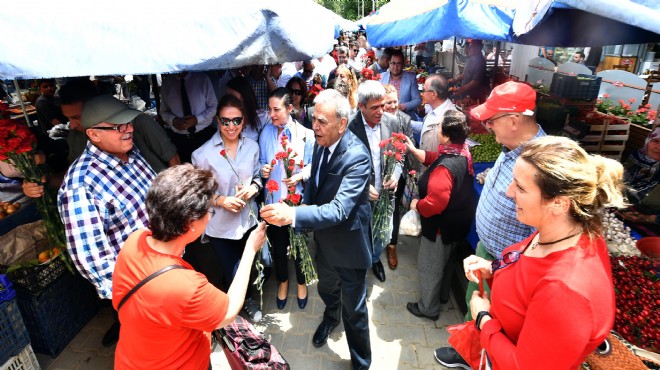 Selçuk Pazarı'nda ve ilçe otogarında tek tek karanfil dağıtan Başkan Aziz Kocaoğlu, bu jestiyle Selçuklu kadınların gönlünü kazanmayı başardı.
