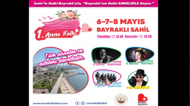 Annelere Günü’ne özel hazırlanan program, 3 gün boyunca Bayraklı sahilinde binlerce yurttaşı bir araya getirecek. Bayraklı Belediyesi ve İzmir Büyükşehir Belediyesi desteğiyle, Kadın Gücü Derneği tarafından organize edilen ‘Anne Kalbi Festivali’ müzik, eğlence, spor, sanat, sahne şovları, panel ve yarışmalarla renkli görüntülere sahne olacak. 50 kadın derneği ve kooperatiflerinin de stantlarıyla yer alacağı festivale katılım ücretsiz olacak. Aktiviteler kapsamında açılacak atölyeler, çekilişler ve sürprizler vatandaşlara eğlenceli anlar yaşatacak.
