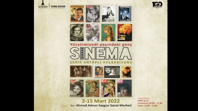 Büyükşehir Belediyesi Ahmed Adnan Saygun Sanat Merkezi (AASSM) önemli bir sergiye daha ev sahipliği yapacak. İzmirli koleksiyoner Şerif Antepli’nin “Yüzyirmiyedi Yaşındaki Genç; Sinema” adını taşıyan sergisi 2 Mart Çarşamba günü kapılarını ziyaretçilere açacak. Şerif Antepli’nin 127 yıllık geçmişi olan sinemayla ilgili birikimlerinden örneklerin yer alacağı sergide afişler, fotoğraflar, dergiler, araçlar, pullar, biblolar, telefon kartları, sakız-çikolata kartları, sigara-kibrit etiketleri, film müzikleri, reklamlar gibi bölümler yer alacak. Eski İzmir Sinemaları, İzmir’de çekilen filmler ve sinemadaki İzmirliler ile ilgili kente özel bölümün de yer alacağı sergide dünya sinemasının 100 önemli filminden örnekler de izlenebilecek.
