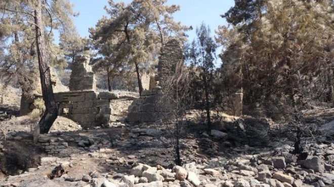 Antik kent içinde yer alan hamam, sarnıç, agora ve tapınak ise yangından dolayı simsiyah oldu. Kent içinde yer alan ve çevresi telle kapatılan sarnıcın olduğu alan da yangında hasar gördü. Sarnıcın içine, yangında oluşan küller doldu. Tabelalar ise yanmayla beraber karardı. Antik kentin girişi de karardı. (DHA)