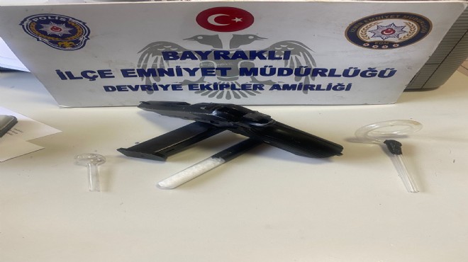 Bayraklı İlçe Emniyet Müdürlüğü Devriye Ekipler Amirliğinde görevli polis memurları sabah saat 08.00 sıralarında durumundan şüphelendiği otomobilin sürücüsüne 'dur' ihtarında bulundu. Otomobilde yapılan aramada 30 gram metamfetamin ve 1 ruhsatsız tabanca ele geçirildi.