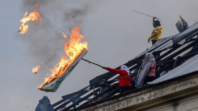 Hapishanenin çatısına çıkan 40'tan fazla mahkum, üzerinde "Hapishanede ölmeyi reddediyoruz" yazılı pankart astı.