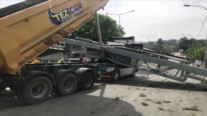 NATO kavşağında devam eden asfaltlama işinde kullanılan, Mehmet Şerif Çağlar idaresindeki özel bir şirkete ait 06 TZ 219 plakalı tırın açık kalan damperi, iki şeritli yolun üzerinden geçen sinyalizasyon levhasına takıldı.