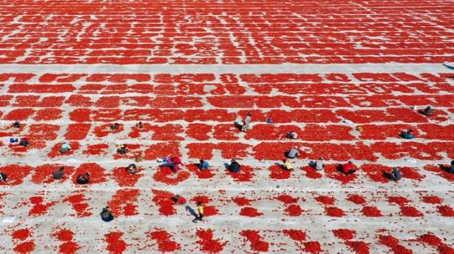 Binbir zahmetle kurutulmaya bırakılan domates işinde çalışanların büyük kısmını oluşturan, Şanlıurfa'nın Siverek ilçesinden gelen çoğunluğu kadın tarım işçileri, gün doğumuyla mesaiye başladı.