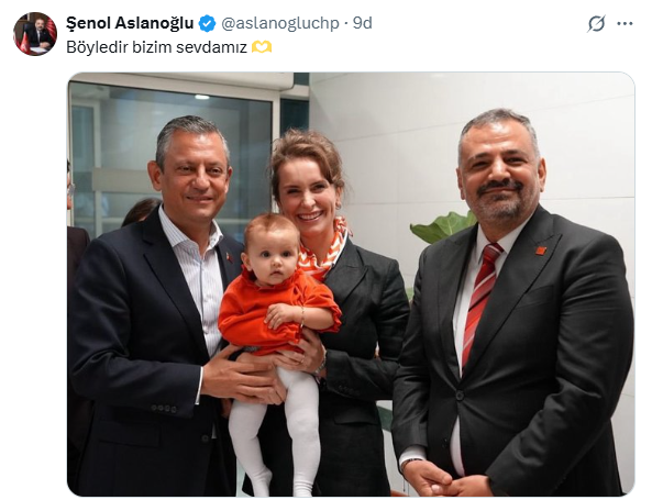 Sosyal medya üzerinden tek cümle ile paylaşım yapan Aslanoğlu gönderisine "Böyledir bizim sevdamız" notunu düştü. Aslanoğlu'nun paylaşımında CHP Genel Başkanı Özgür Özel, eşi Duygu Aslanoğlu ve kızı Vera ile olan fotoğraf da yer aldı.